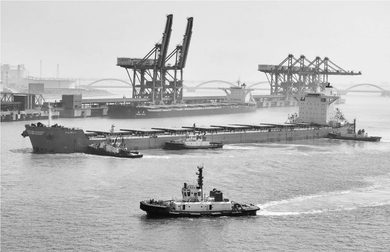 從河北省唐山市海洋口岸和港航管理局獲悉,今年1至6月份,唐山港全港完成貨物吞吐量43356萬噸,同比增長0.75%。圖為7月18日,輪船在拖輪的協(xié)助下向唐山港曹妃甸港區(qū)礦石碼頭靠泊(無人機(jī)照片)。