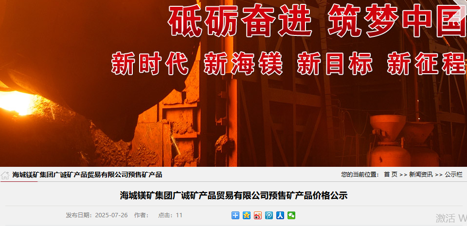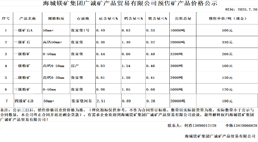 海城鎂礦集團(tuán)廣誠礦產(chǎn)品貿(mào)易有限公司預(yù)售礦產(chǎn)品價格公示