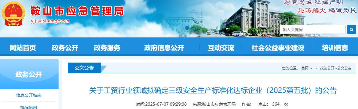 根據(jù)《應(yīng)急管理部關(guān)于印發(fā)<企業(yè)安全生產(chǎn)標(biāo)準(zhǔn)化建設(shè)定級辦法>的通知》(應(yīng)急〔2021〕83號)《遼寧省應(yīng)急管理廳關(guān)于印發(fā)<遼寧省工貿(mào)企業(yè)安全生產(chǎn)標(biāo)準(zhǔn)化實施辦法>的通知》(遼應(yīng)急規(guī)范〔2022〕3號)《鞍山市應(yīng)急管理局關(guān)于印發(fā)<鞍山市應(yīng)急管理局安全生產(chǎn)標(biāo)準(zhǔn)化建設(shè)工作辦法>的通知》(鞍應(yīng)急發(fā)〔2023〕51號)等文件規(guī)定,經(jīng)企業(yè)自評、申請、評審、復(fù)審、公示等程序,確定鞍山市新迪爐業(yè)耐火材料有限公司、海城市后英興東耐火材料有限公司、遼寧乾峰建筑工程有限公司、鞍山市和豐耐火材料有限公司、臺安縣欣鑫礦產(chǎn)品加工有限公司、鞍山熱能滑動機(jī)械有限責(zé)任公司和遼寧俊龍耐火材料有限公司,共七家為工貿(mào)行業(yè)安全生產(chǎn)標(biāo)準(zhǔn)化三級企業(yè),有效期自公告之日起3年。