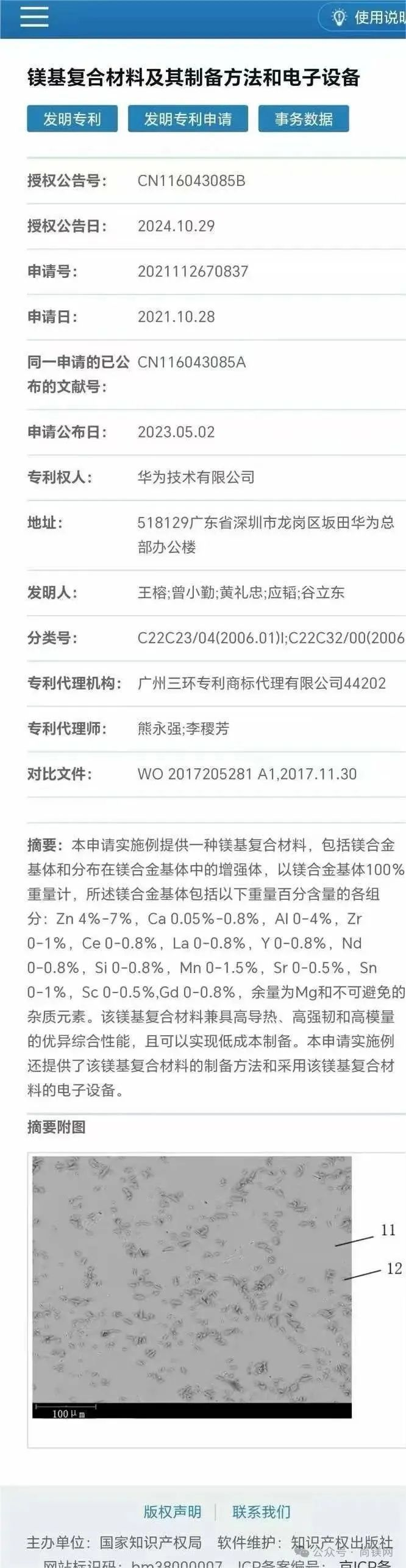 近日,國家知識產(chǎn)權局信息顯示,華為技術有限公司取得一項名為“鎂基復合材料及其制備方法和電子設備”的專利,授權公告號CN 116043085 B,申請日期為2021年10月。該專利來自于上海交通大學曾小勤教授團隊與華為技術有限公司產(chǎn)學研項目的合作成果。