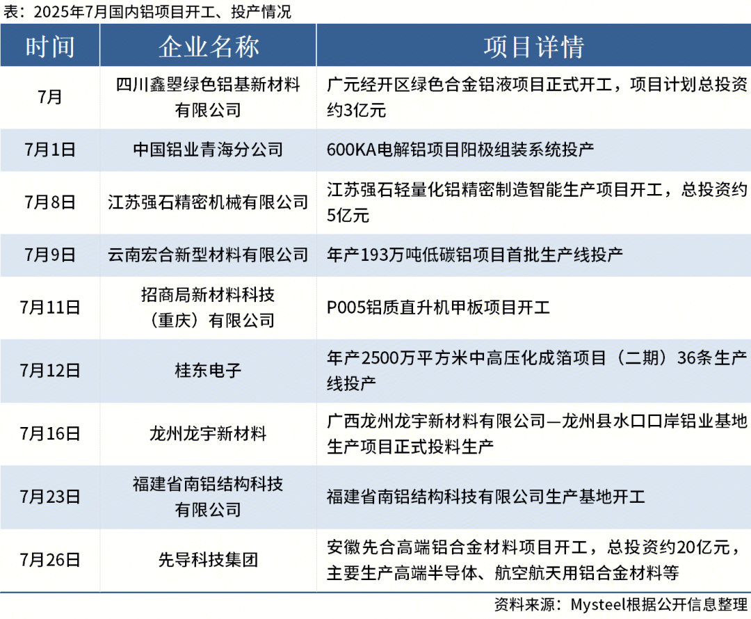 據(jù)不完全整理,2025年7月國(guó)內(nèi)共9個(gè)鋁項(xiàng)目開工、投產(chǎn)。