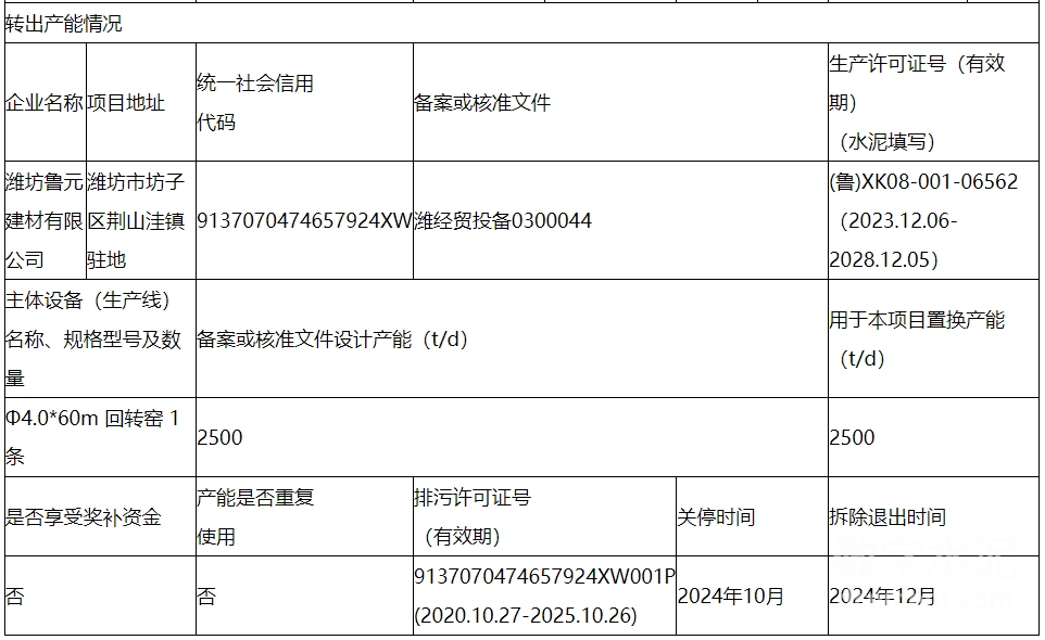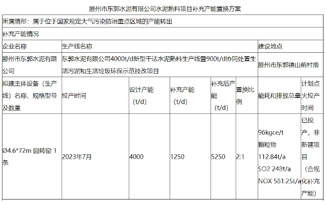 根據(jù)公示,東郭水泥有限公司4000t/d新型干法水泥熟料生產(chǎn)線暨900t/d協(xié)同處置生活污泥和生活垃圾環(huán)保示范技改項(xiàng)目補(bǔ)充產(chǎn)能1250t/d,補(bǔ)充后產(chǎn)能5250t/d,置換比例為2:1。轉(zhuǎn)出產(chǎn)能來自濰坊魯元建材有限公司2500t/d水泥熟料生產(chǎn)線,已于2024年12月拆除退出。