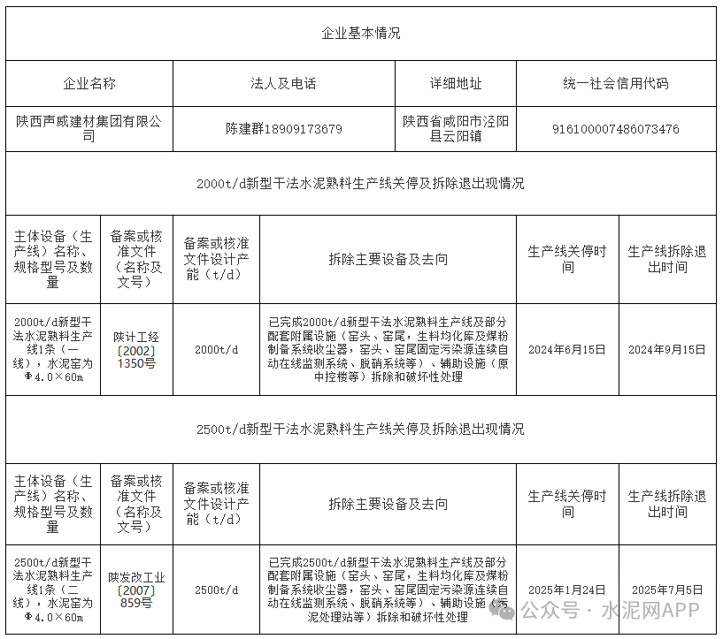 公示顯示,按照工信部《水泥玻璃行業(yè)產(chǎn)能置換實施辦法(2024年本)》(工信部原〔2024〕206號)和陜西省工業(yè)和信息化廳《關(guān)于對陜西聲威建材集團(tuán)有限公司原廠區(qū)內(nèi)“拆二合一”技術(shù)改造項目水泥熟料生產(chǎn)線產(chǎn)能的復(fù)函》(陜工信函〔2022〕104號)要求,陜西聲威建材集團(tuán)有限公司原有2000t/d、2500t/d水泥熟料生產(chǎn)線已完成關(guān)停和拆除退出,現(xiàn)對關(guān)停和拆除退出進(jìn)行公示。