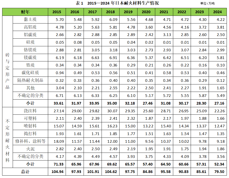 據(jù)日本耐火材料技術(shù)協(xié)會(huì)統(tǒng)計(jì)數(shù)據(jù),2024年日本全年耐火材料產(chǎn)量79.50萬噸,比2023年的85.61萬噸下降了大約7.1%;其中,定形耐火產(chǎn)品為27.16萬噸,同比下降了約4.0%(上年約為28.30萬噸);不定形耐火材料產(chǎn)量大約為52.34萬噸,同比下降約8.7%(上年同期為57.31萬噸)。