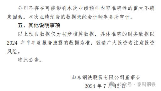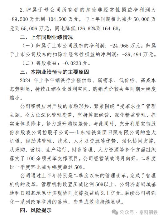 7月11日,山東鋼鐵發(fā)布2024年半年度業(yè)績預告,預計2024年半年度歸母凈利潤為虧損8.90億元到10.40億元,與上年同期相比減少6.40億元到7.90億元,同比降低256.5%到316.58%;歸母扣非凈利潤虧損8.95億元到10.45億元,與上年同期相比減少5.00億元到6.50億元,同比降低126.62%到164.6%。對于業(yè)績變動主要原因,山東鋼鐵表示,2024年上半年鋼鐵行業(yè)強供給、弱需求、低價格、高成本態(tài)勢明顯,持續(xù)壓縮企業(yè)盈利空間,購銷差價較去年同期大幅度縮小。上半年預計虧損8.9億元-10.4億元,但公司上半年特別是二季度以來采取的“變革求生”措施逐漸顯效,經(jīng)營業(yè)績逐月向好,二季度環(huán)比一季度減虧超50%。2023年底,中國寶武集團入股山鋼集團、寶鋼股份戰(zhàn)略投資山鋼股份核心資產(chǎn)山鋼日照以來,山鋼集團核心管理團隊也作出重大調整,新團隊提出“扭虧增盈、歸母為正”的目標,而作為鋼鐵主業(yè)上市公司的山東鋼鐵承擔著集團扭虧增盈的重要責任,在行業(yè)整體不景氣的大背景下“變革求生”,推行各類節(jié)本增效舉措,與寶武集團、寶鋼股份開展協(xié)同支撐發(fā)揮合作紅利,變革成效逐漸顯現(xiàn)。