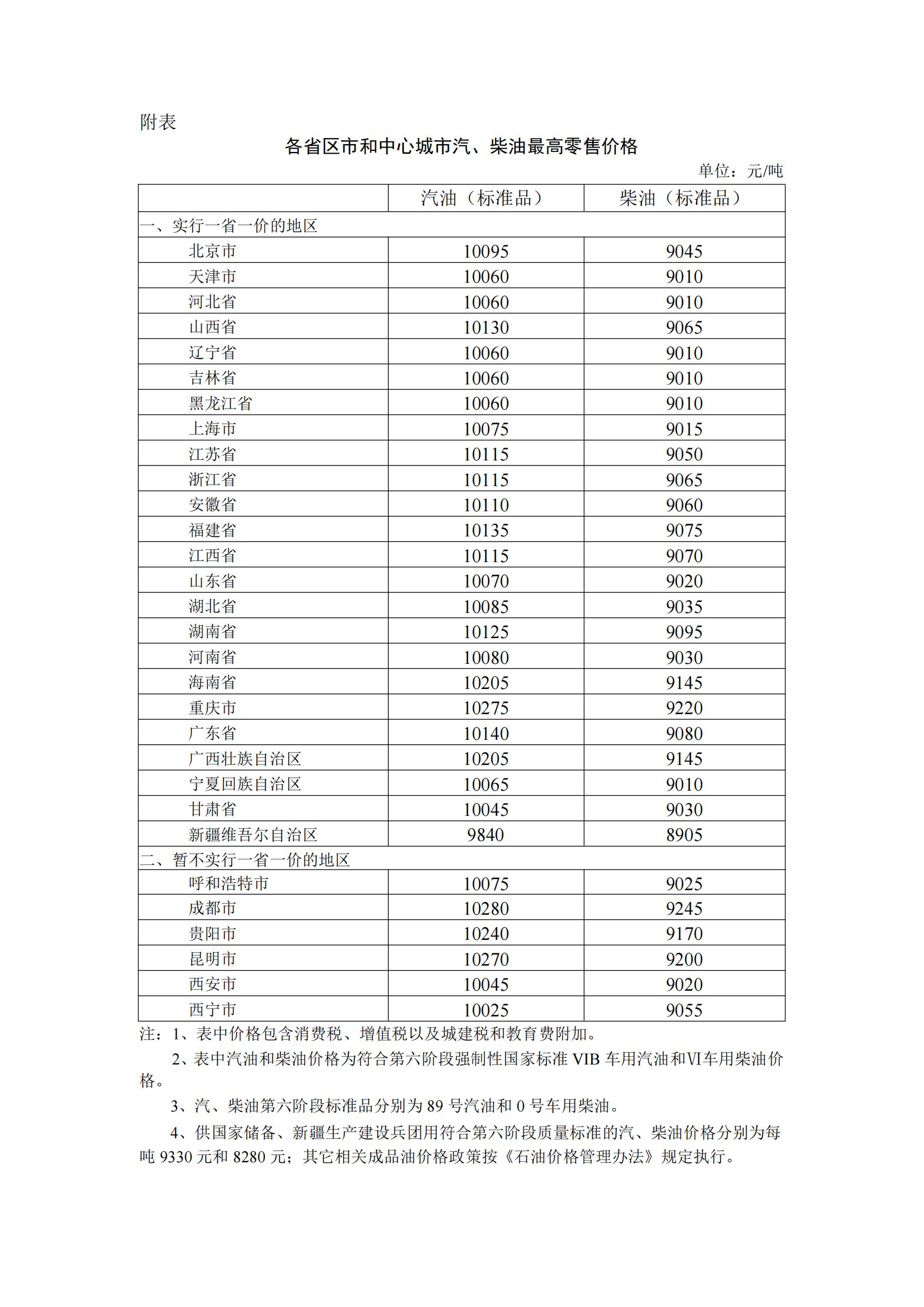 附:各省區(qū)市和中心城市汽、柴油最高零售價格