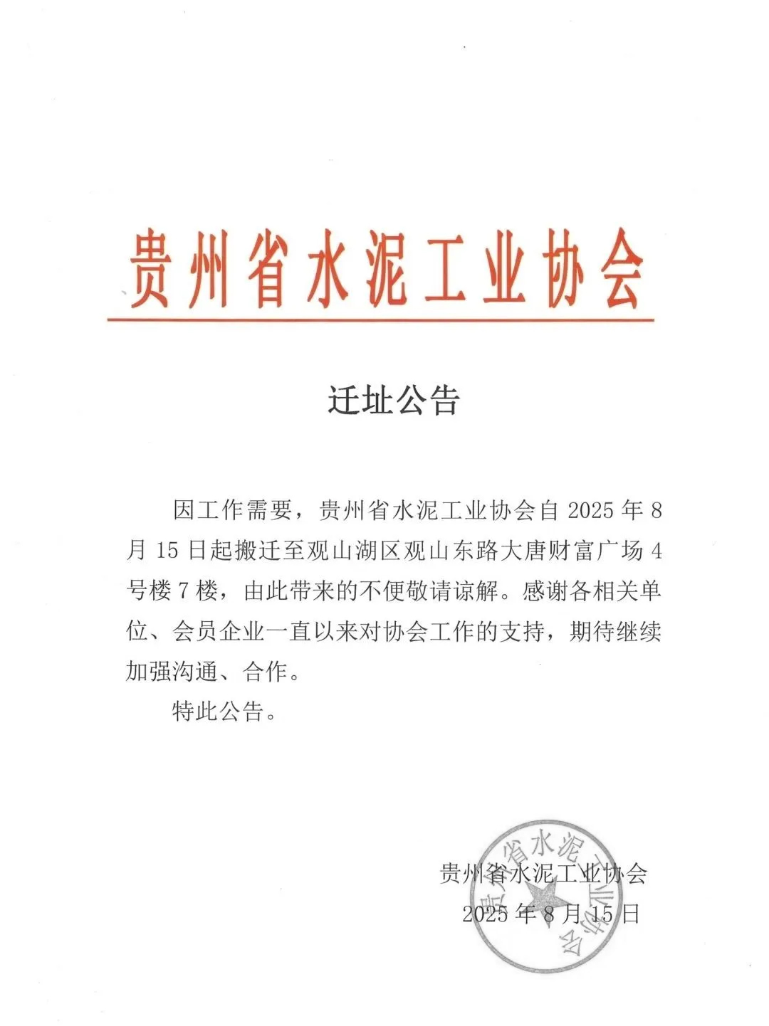 8月15日, 貴州省水泥工業(yè)協(xié)會(huì)發(fā)布《遷址公告》稱(chēng),因工作需要,貴州省水泥工業(yè)協(xié)會(huì)自2025年8月15日起搬遷至觀(guān)山湖區(qū)觀(guān)山東路大唐財(cái)富廣場(chǎng)4號(hào)樓7樓。