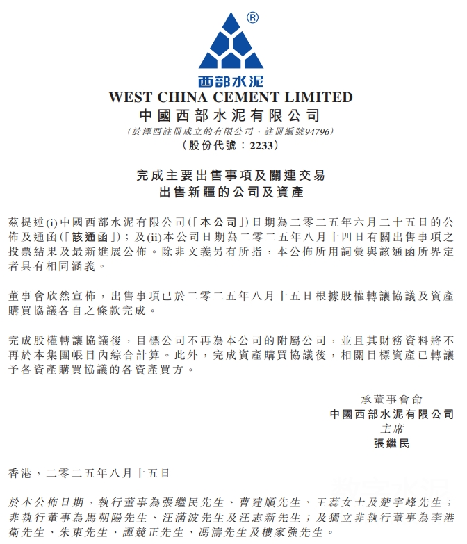 6月25日晚,西部水泥發(fā)布公告稱,擬出售旗下新疆的公司和資產(chǎn),各目標(biāo)公司均主要從事水泥及水泥產(chǎn)品的制造及銷售、石灰石及建筑材料的銷售以及提供廢物處理服務(wù)的公司,累計(jì)作價16.5億。