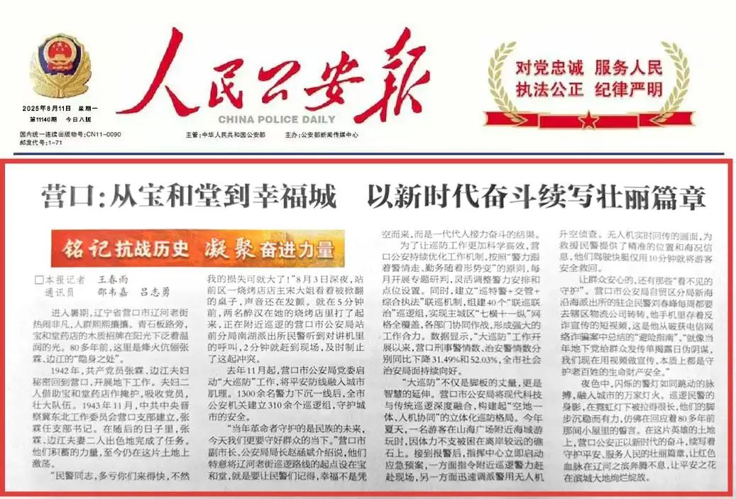 8月11日,《人民公安報(bào)》頭版【銘記抗戰(zhàn)歷史 凝聚奮進(jìn)力量】專欄以“營口:從寶和堂到幸福城 以新時(shí)代奮斗續(xù)寫壯麗篇章”為題,報(bào)道了營口市公安局黨委部署常態(tài)化開展“大巡防”工作、全力守護(hù)人民幸福安寧的通訊稿件。