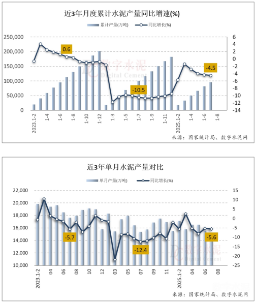 國家統(tǒng)計局數(shù)據顯示,2025年1-7月,全國累計水泥產量9.58億噸,同比下降4.5%,降幅較1-6月擴大0.2個百分點,較去年同期收窄6個百分點。7月份,全國單月水泥產量1.46億噸,環(huán)比下降6.4%,同比下降5.6%。單月和累計產量均為2010年以來同期最低水平。