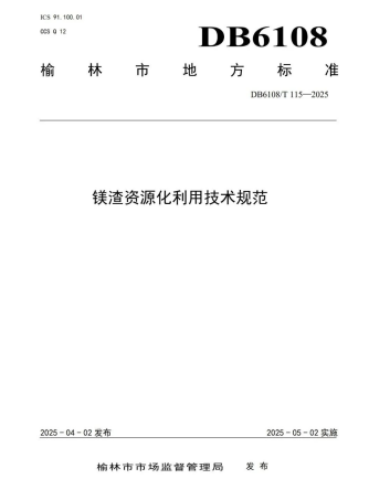 榆林市地方標(biāo)準(zhǔn)《鎂渣資源化利用技術(shù)規(guī)范》(DB6108/T 115—2025)已經(jīng)由榆林市市場(chǎng)監(jiān)督管理局于2025年4月發(fā)布,5月2日起實(shí)施。