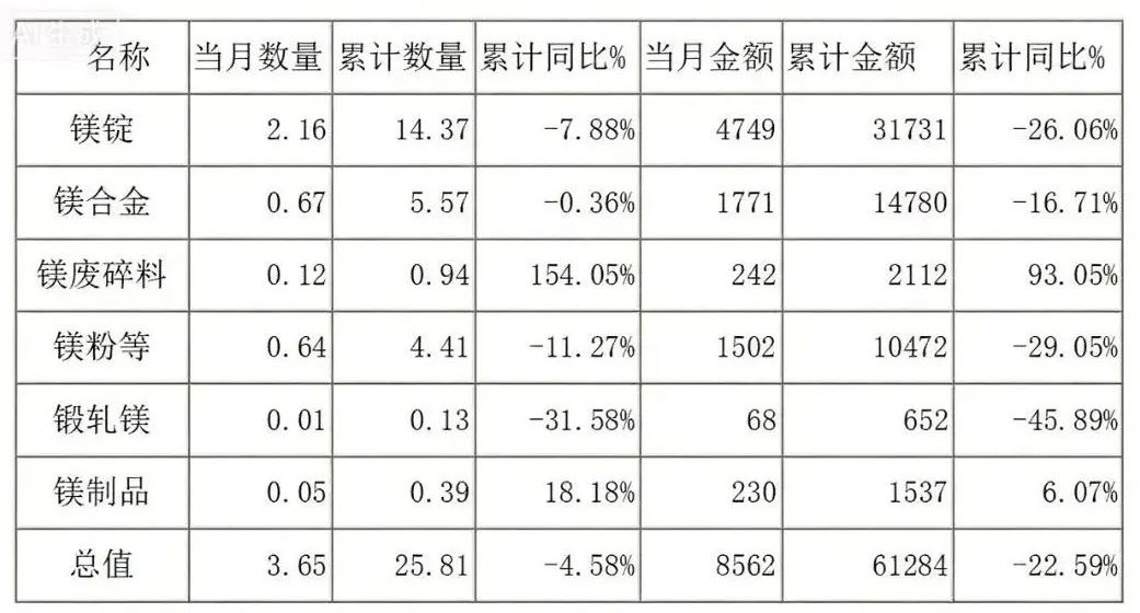 2025年7月份中國出口各類鎂產(chǎn)品約3.65萬噸,環(huán)比增長2.82%,同比增長6.10%;