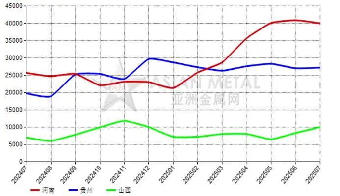 7月份,中國棕剛玉庫存量最大的三個省份為河南、貴州和山西。河南庫存棕剛玉為40,000.00公噸,同比增加55.64%,環(huán)比減少2.20%。貴州庫存棕剛玉為27,200.00公噸,同比增加37.37%,環(huán)比增加0.74%。山西庫存棕剛玉為10,000.00公噸,同比增加42.86%,環(huán)比增加20.48%。