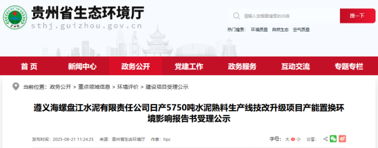 8月21日,貴州省生態(tài)環(huán)境廳發(fā)布“遵義海螺盤江水泥有限責(zé)任公司日產(chǎn)5750噸水泥熟料生產(chǎn)線技改升級(jí)項(xiàng)目產(chǎn)能置換環(huán)境影響報(bào)告書受理公示”。