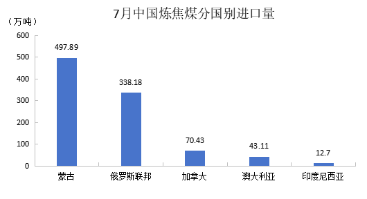 7月份,我國(guó)進(jìn)口煉焦煤962.3萬(wàn)噸,環(huán)比增長(zhǎng)5.65%(51.46萬(wàn)噸),但同比下降11.2%(121.83萬(wàn)噸)。1-7月累計(jì)進(jìn)口煉焦煤6248.23萬(wàn)噸,同比累計(jì)下降8.42%(574.48萬(wàn)噸)。分國(guó)別看,排名靠前的國(guó)家是蒙古國(guó)(497.89萬(wàn)噸)、俄羅斯(338.18萬(wàn)噸)、加拿大(70.43萬(wàn)噸)、澳大利亞(43.11萬(wàn)噸)。
